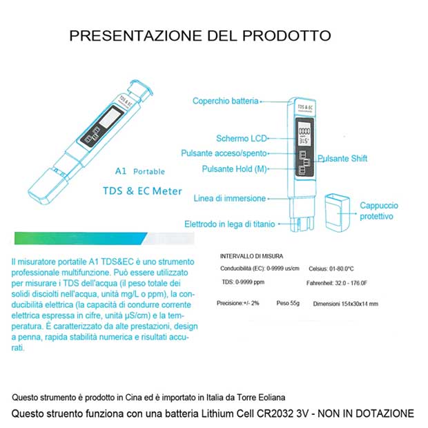 Questo strumento funziona con una batteria LITHIUM CELL CR2032 3V NON COMPRESA NELLA CONFEZIONE